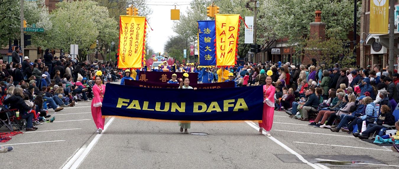 二零一八年第八十九届国际郁金香节(Holland's Tulip Time Festival)从五月五日开始。作为密西根州规模最大,最壮观的游行之一,压轴游行在五月十二日由军乐队游行(Bands Parade)和音乐游行(Muziek Parade)组成,在荷兰市中心的街道上举行超过两英里的庆祝活动,吸引了超过二十五万名现场观众。密西根法轮大法学会首次参加了本次压轴的音乐游行,在花海中,密西根州和加拿大温莎市的法轮功学员们把法轮大法的美好传递给现场观众,并借此庆祝法轮大法洪传世界二十六周年。