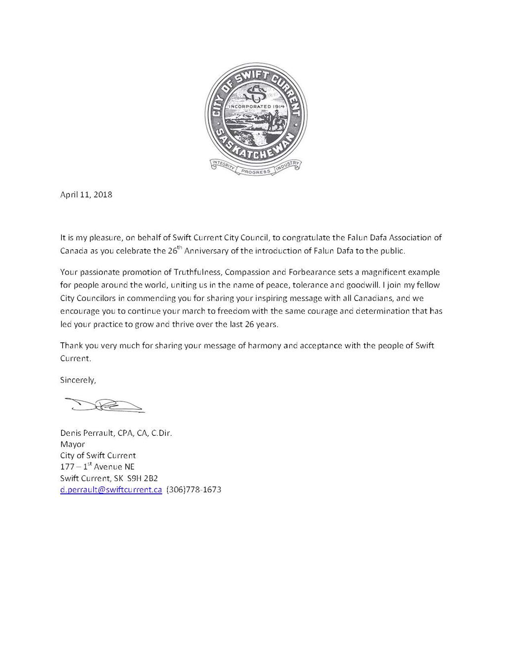 萨斯喀彻温省Swift Current市长Denis Perrault为法轮大法传世26周年发来贺信表示:“谨代表Swift Current市议会,在你们庆祝法轮大法传世26周年之际,我非常荣幸能向加拿大法轮大法学会表达祝贺。”