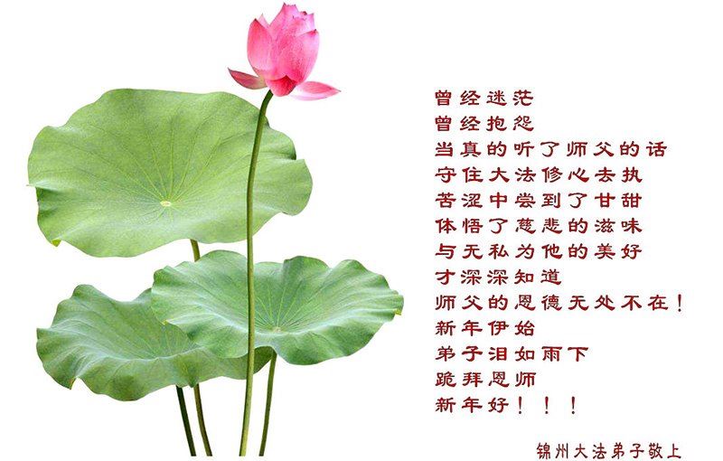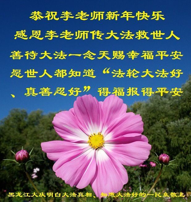 “感恩李大师的救度,派天使送给我一张‘翻墙’的光盘,使我迷途找到了人生的方向,幸福可以传递,我会把真善忍的温暖告诉我的挚爱亲朋、告诉和我一样迷茫的邻里街坊,盼望李大师早日回国,恩泽众生,我们已经看到了新世纪的曙光!”