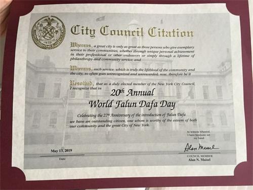 ![]() 图7:纽约市第四十六选区市议员艾伦·迈泽尔(Alan N. Maisel)发来荣誉证书祝贺第二十届法轮大法日暨大法洪传世界二十七周年。 |