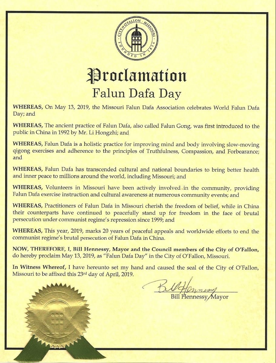 密苏里州奥法隆市(O'Fallon)市长比尔﹒汉尼斯(Bill Hennessy)颁发褒奖,宣布法轮大法日。褒奖译文如下: