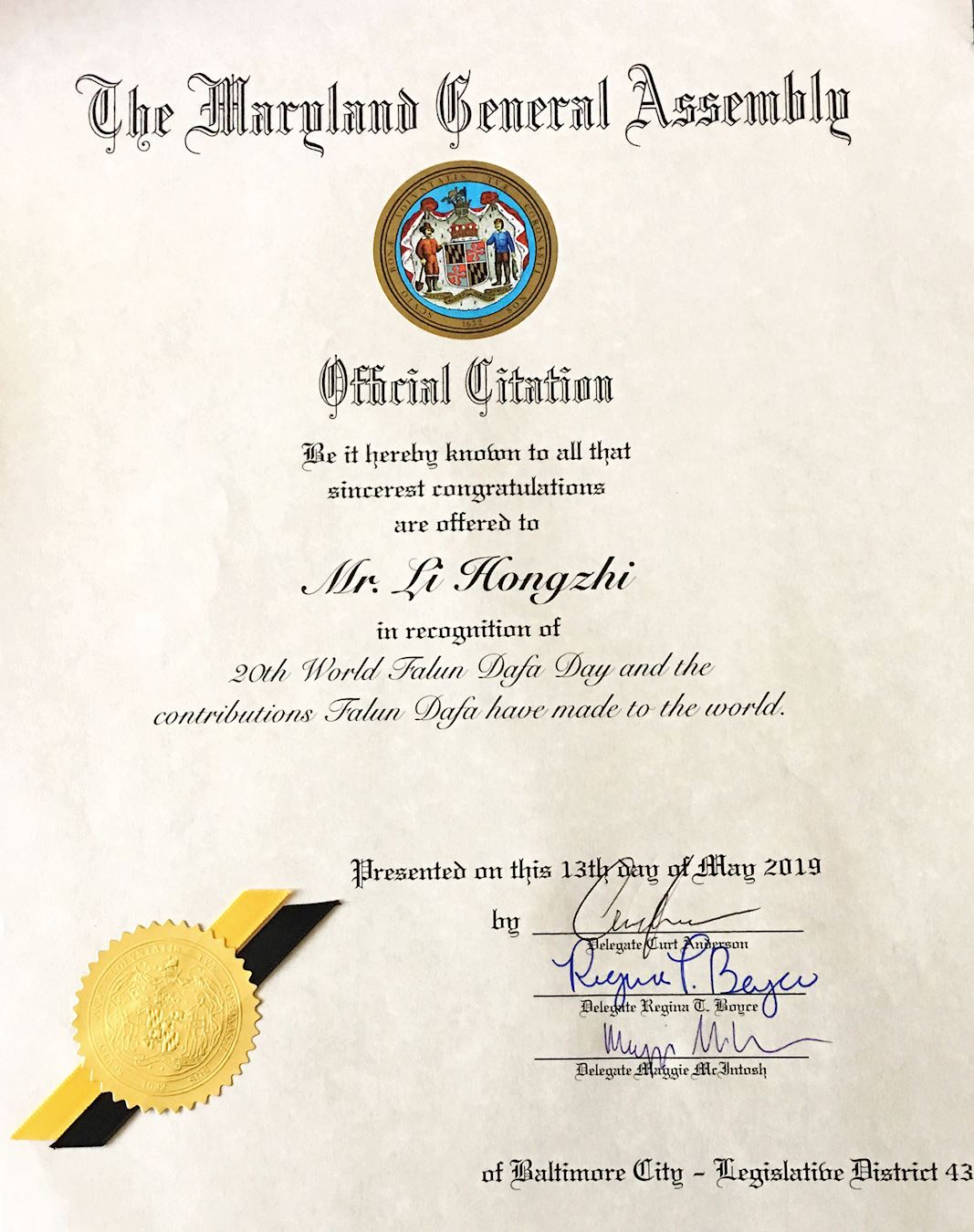 【明慧网二零一九年六月七日】在第二十届世界法轮大法日及法轮大法传世二十七周年之际,代表美国巴尔的摩市第四十三选区的三位马里兰州众议员——库尔特·安德森(Curt Anderson)、雷吉纳·博伊斯(Regina T. Boyce)、玛吉·麦克尔托什(Maggie Mclntosh)联名颁发褒奖令,向法轮大法创始人李洪志先生致以最诚挚的祝贺。