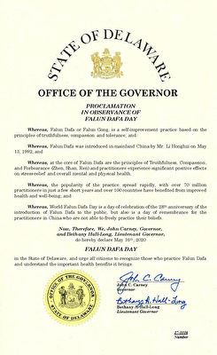 为此,我们,州长约翰·卡尼(John C. Carney)及副州长瑟尼·霍尔隆(Bethany A. Hall-Long),特此宣布2020年5月16日为德拉华州“法轮大法日”(FALUN DAFA DAY)。并敦促所有公民都尊重那些修法轮大法的人,并了解法轮大法所带来的重要的身心健康福祉。