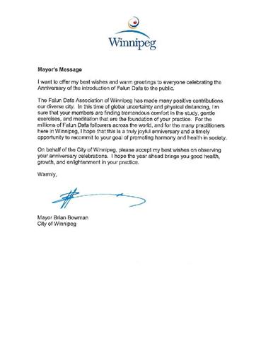 温尼伯市(Winnipeg)市长褒曼( Brian Bowman)的贺信写道:温尼伯法轮大法协会为我们这个多元文化城市做出了很多贡献。在目前全球大动荡、人们保持社交距离的特殊时期,我相信你们的成员正在学法、炼功、打坐静修中获得极大的安慰,这是你们功法的基础。我祝愿全世界上千万的法轮功学员,和所有温尼伯的法轮功学员,一个欢欣愉悦的法轮大法日,我希望这是你们向社会倡导和谐、健康的绝佳机会。