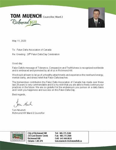 ![]() 图13:列治文山(Richmond Hill)市议员汤姆·穆恩奇(Tom Muench)的贺信 |