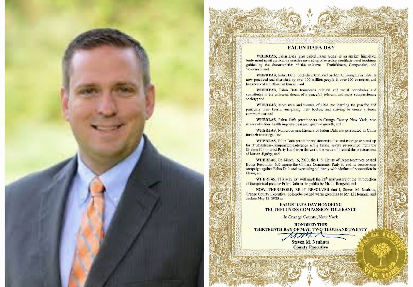 鉴此,我,纽约州橙县(Orange County)县长史蒂文·诺伊豪斯(Steven M. Neuhaus),特此决定,向李洪志先生致以热情的问候,并宣告二零二零年五月十三日为纽约州橙县