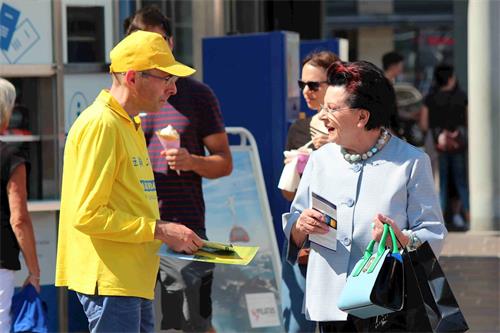 葛根夏次女士(Monika Gegenschatz)退休前曾是一位企业家,她也曾在卢塞恩以往的信息日活动上了解到法轮功学员被迫害很久了,并一直都签名支持法轮功。当再次遇到法轮功学员后,她很想了解法轮功的近况,和学员谈了很久,临行前她再次签名要求瑞士联邦政府采取措施制止中共活摘器官的罪行。