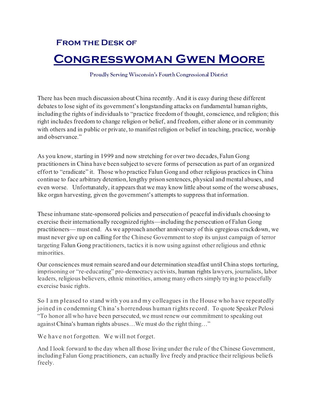 我曾一度担任国会中国问题执行委员会的副主席,我强调应呼吁中国政府保障所有宗教团体的信仰自由。我将继续向中共施压,要求中共停止对法轮功学员的迫害,释放所有因追求信仰而被关押的学员,并敦促美国政府采取行动,揭露和惩罚中共所犯的侵犯人权的行为。