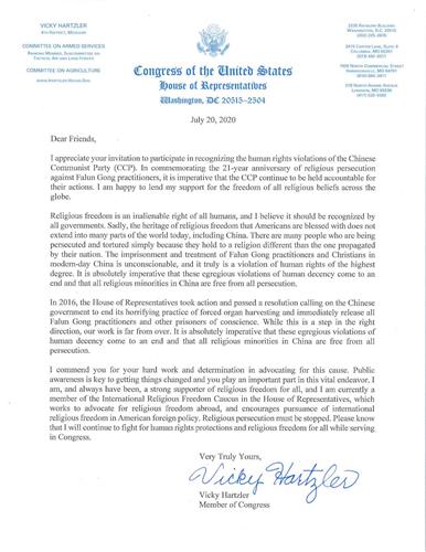 ![]() 图9:密苏里州国会众议员维琪‧哈茨勒(Vicky Hartzler)写给法轮功学员的声援信。 |