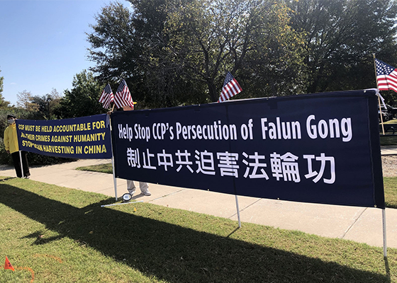 达拉斯地区的法轮功学员自2020年9月以来,一直在周末到附近城市繁华的街道展示真相横幅,向居民曝光中共的恶行,包括21年来对法轮功学员的酷刑迫害、活摘法轮功学员器官的罪恶。