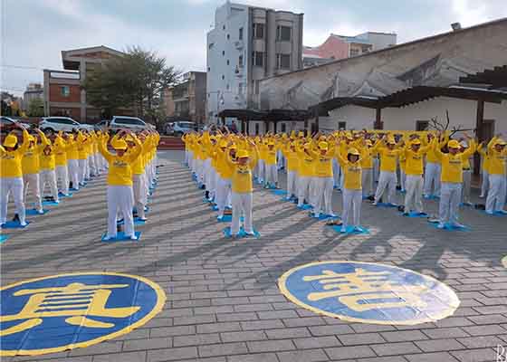 四月十日,台湾彰化地区部份法轮功学员在鹿港镇公会堂广场上炼功弘法,并向过往民众讲真相、征签等。学员们整齐划一的炼功动作、悠扬的炼功音乐,吸引过往的民众驻足观看。