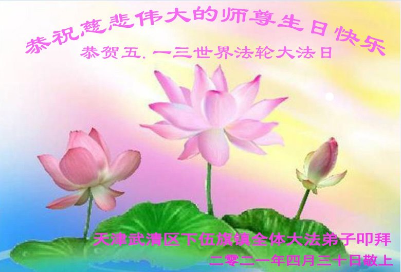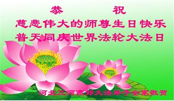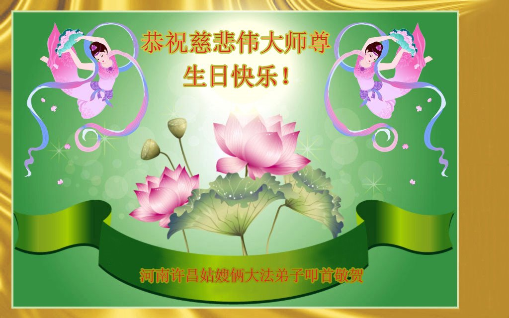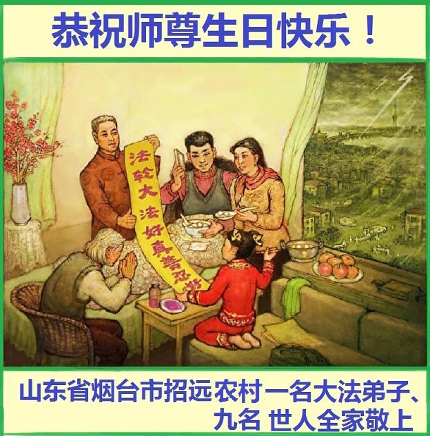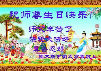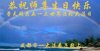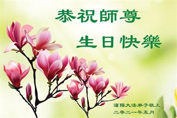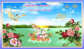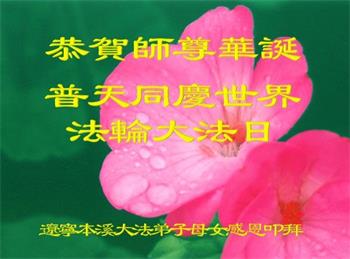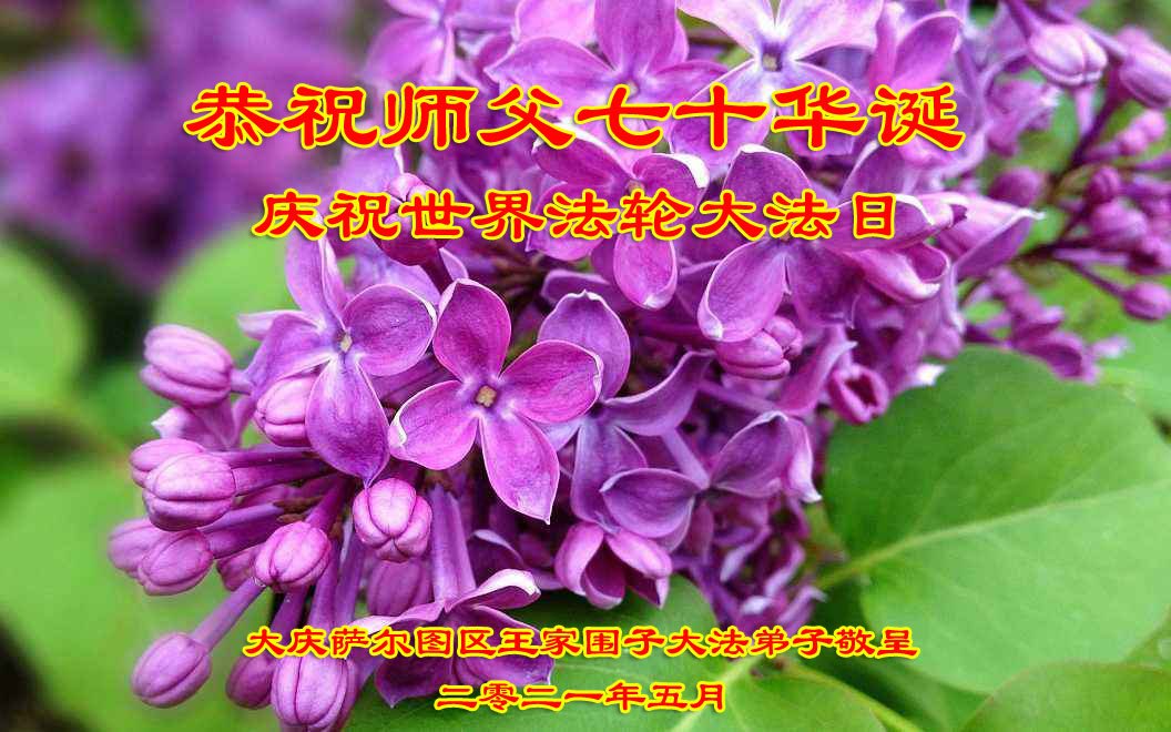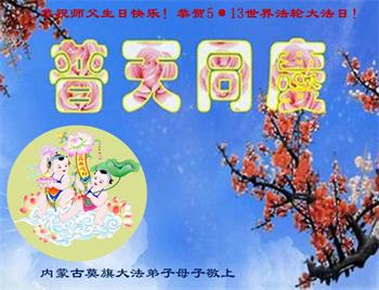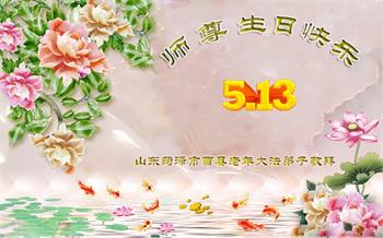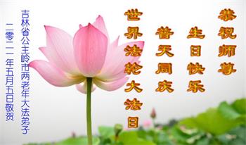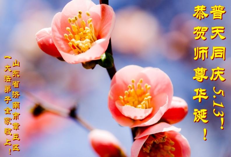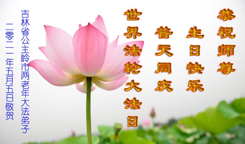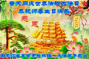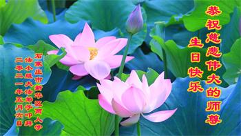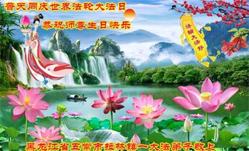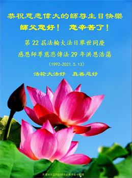师尊您好!弟子恭祝师尊华诞!恭贺世界法轮大法日!在这普天同庆的日子里,弟子同歌同颂师尊之无量慈悲:感恩师尊把大法传给弟子,指引我们走上返本归真的大道;感恩师尊教导弟子做一个为他的生命,危难中不忘救度众生。弟子一定不忘使命,学好法,多救人,带领众生圆满随师还!弟子叩谢师恩!