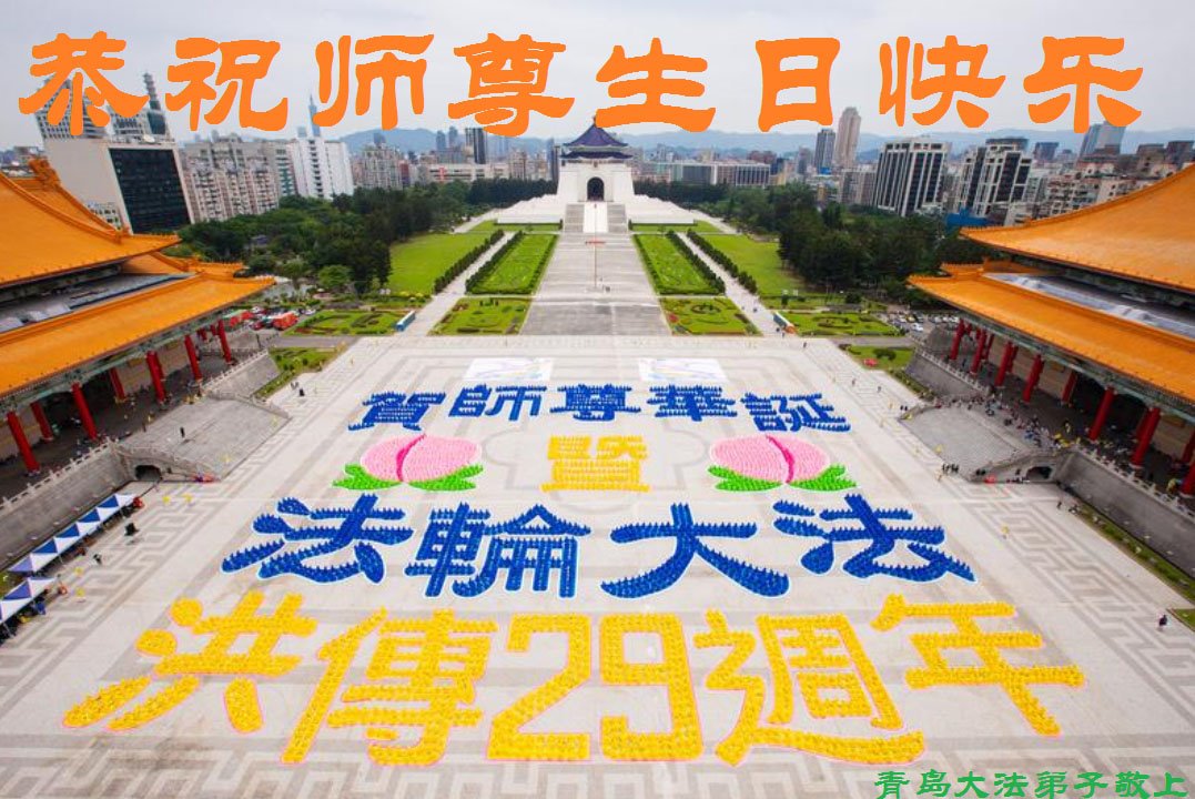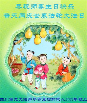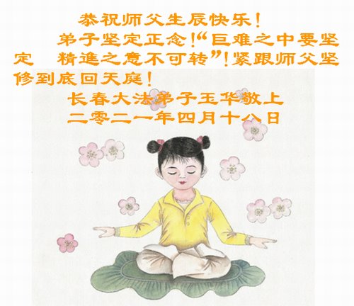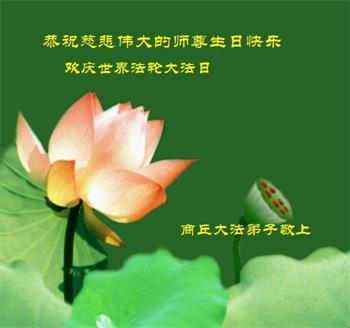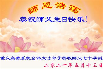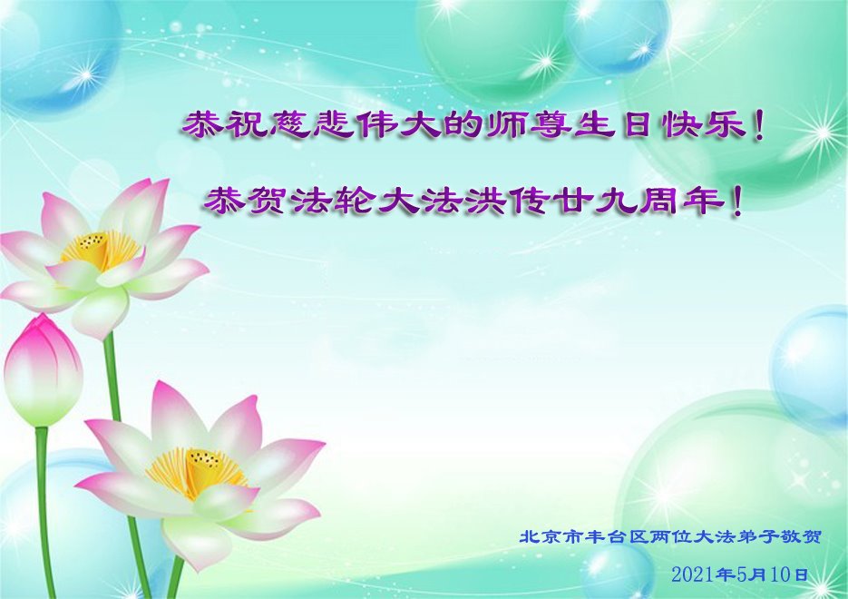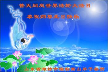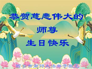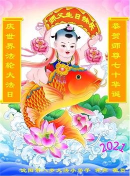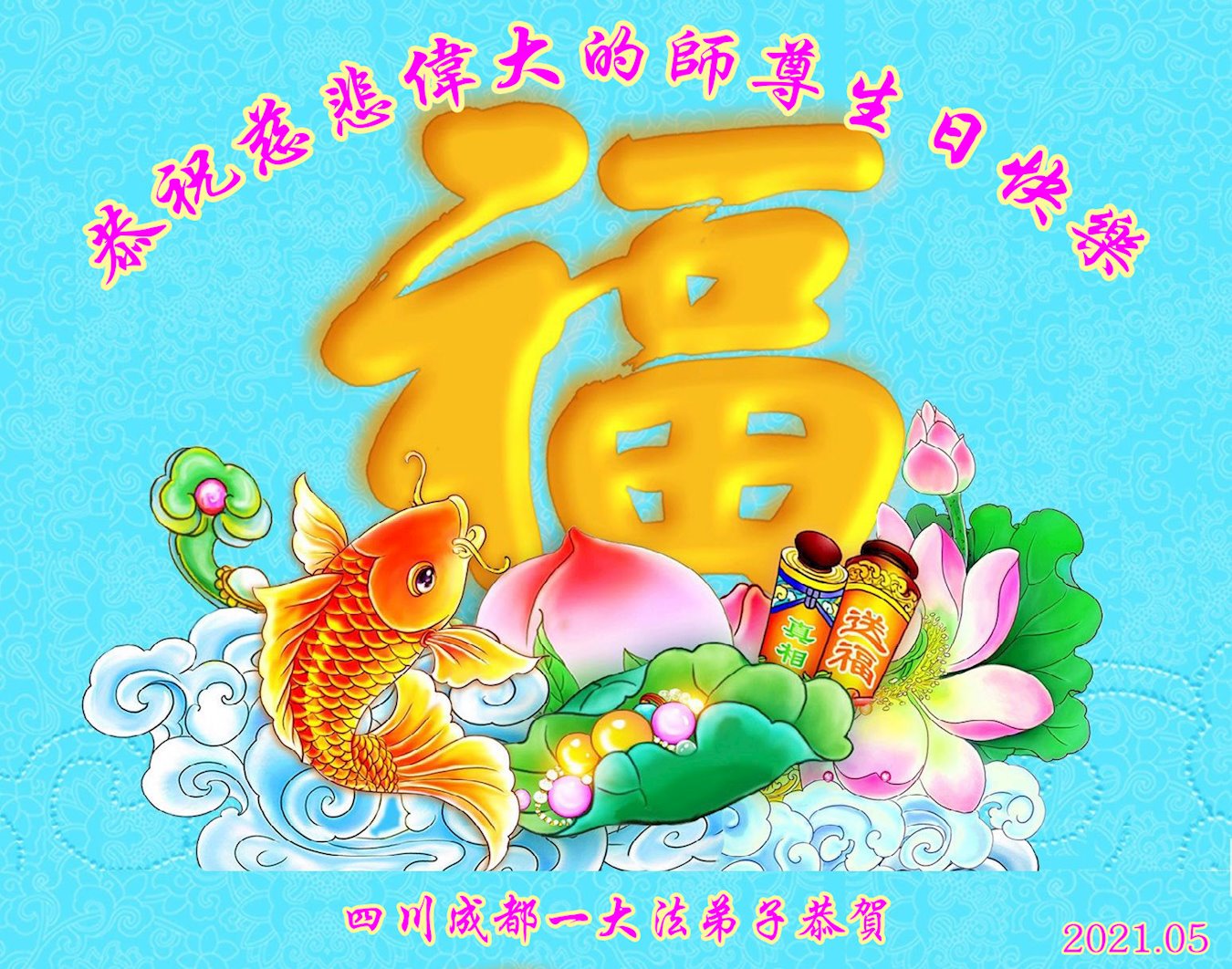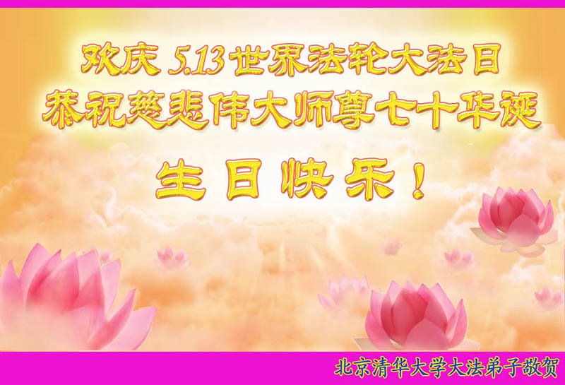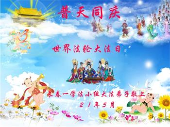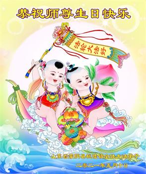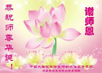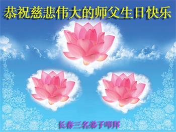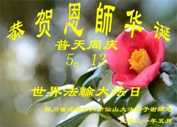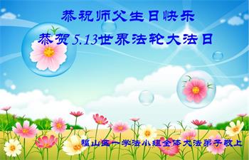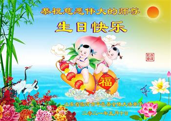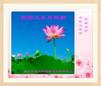 福建省福州市一大法弟子在贺词中说:“弟子双手合十,发自心底的恭祝慈悲伟大的师父华诞!每当5·13这辉煌的日子到来之际,弟子内心都充满对师父的无比感恩和思念。是师父把我脱胎换骨,重塑成一个全新的真我。”