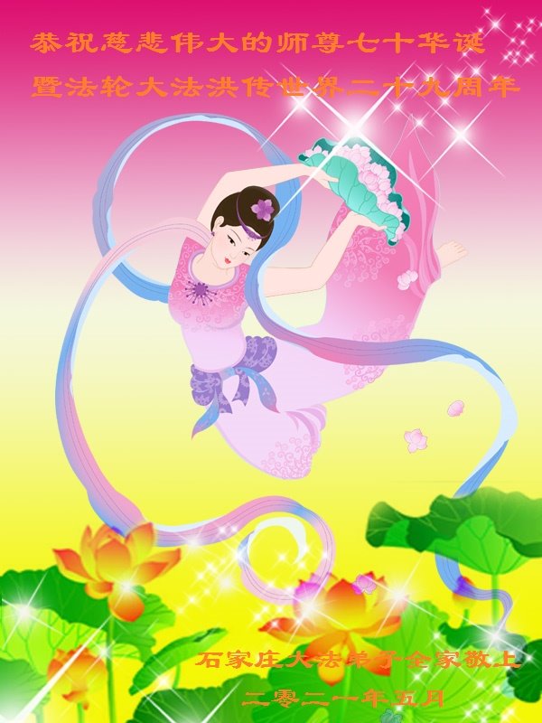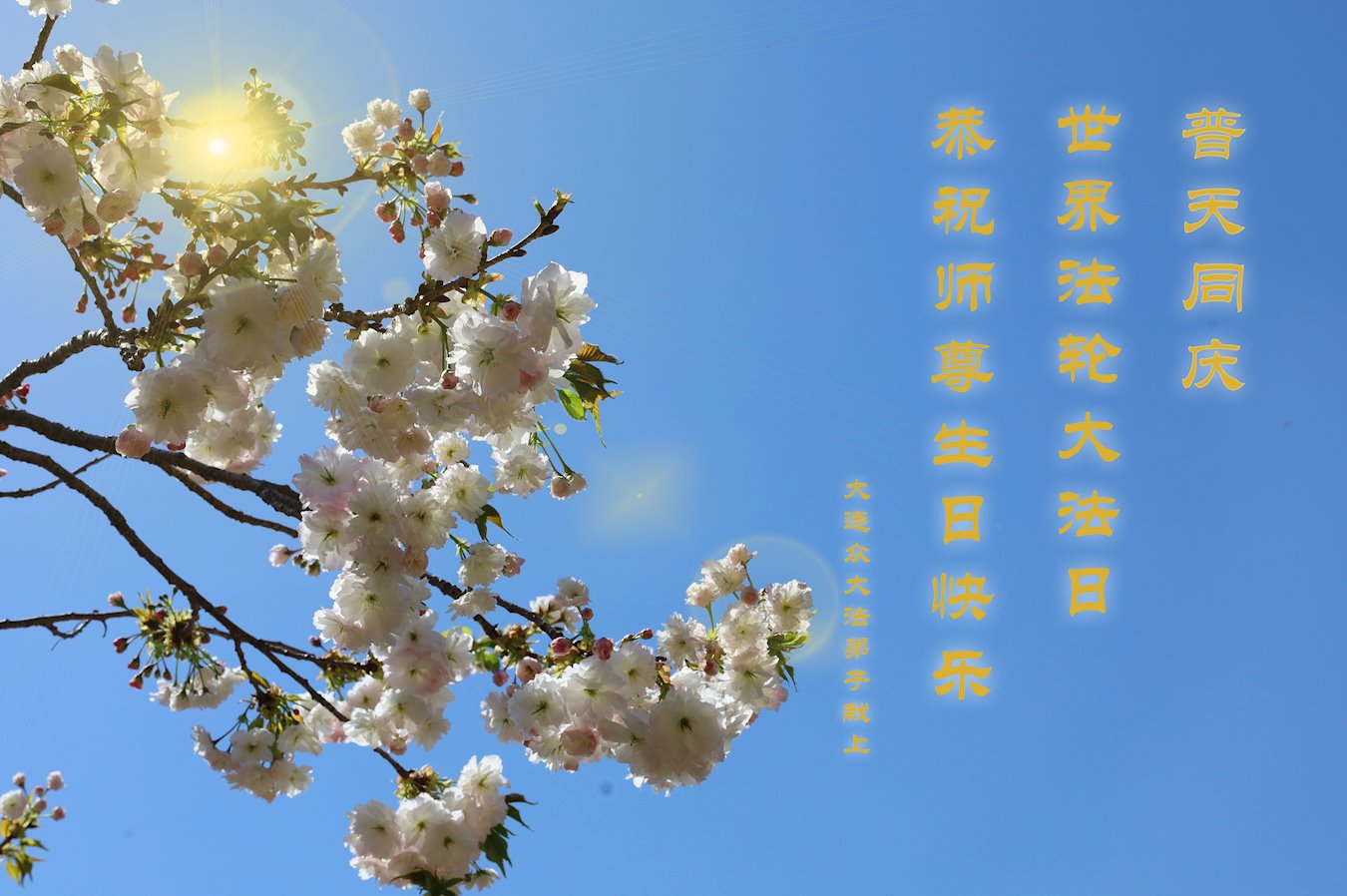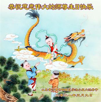 师尊好!师尊辛苦了!今年是伟大慈悲的师尊七十岁华诞,也是法轮大法日。在这普天同庆同颂的伟大光辉日子里,我们怀着无比感恩的心情,热泪泉涌,发自肺腑的一遍又一遍的颂唱着“法轮大法好”、“师恩颂”美好的歌曲,讴歌师尊威德无量、法力无边、叩谢师尊的慈悲苦度!