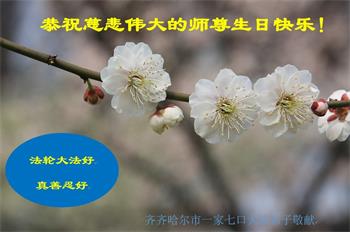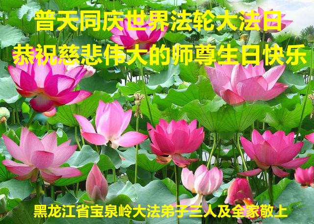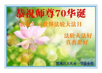 黑龙江大兴安岭老年大法弟子学法小组写道:“我们都没有见过师父,在师父华诞来临之际,我们都非常想念师父,只能远隔重洋遥祝慈悲伟大的师父生日快乐!在这末劫最后时期,我们要更加勇猛精進。”