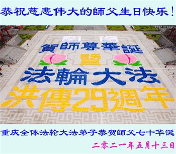 欢天喜地庆师尊七十岁华诞!载歌载舞贺世界法轮大法日!回顾二十二年正法修炼路,魔难重重,惊心动魄。师尊力挽狂澜,破迷导航,救苍宇于危难中。弟子深感法轮大法的珍贵,这是人类得救的唯一希望。藉五月十三日这殊胜的节日,弟子们向慈悲伟大的师尊叩首、跪拜!