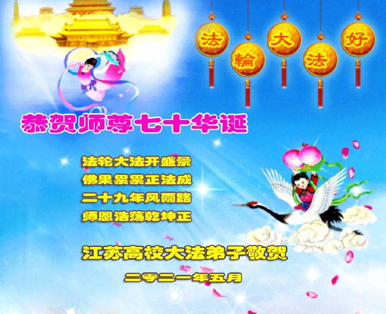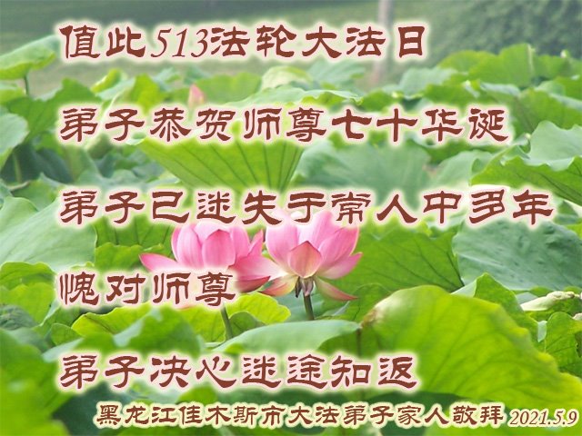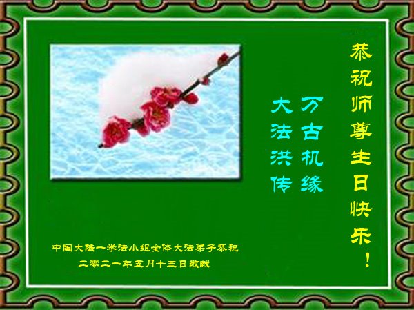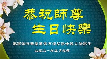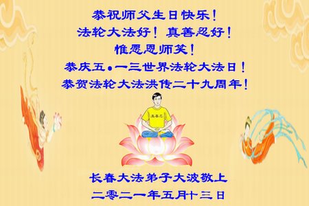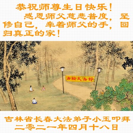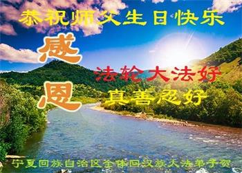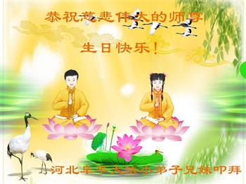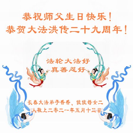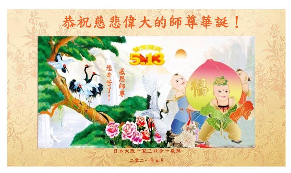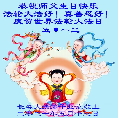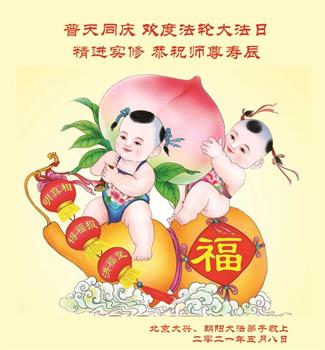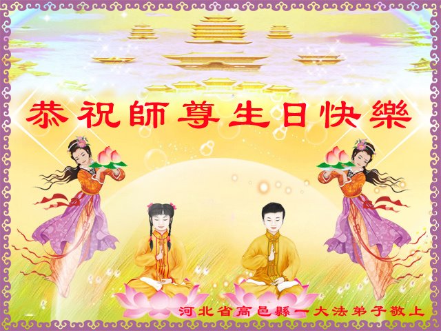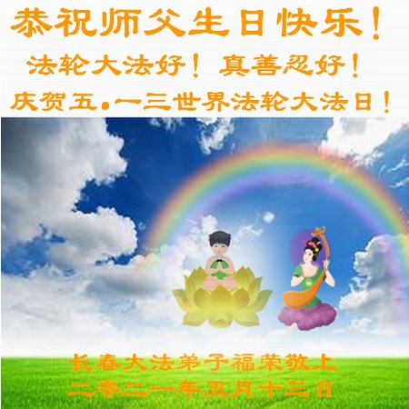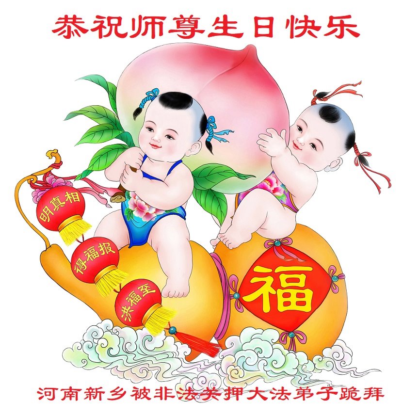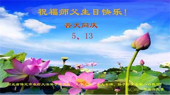 尊敬的师父:您好!您辛苦了!在“五·一三”到来之前,弟子心情好内疚,又一年了,自己提高了多少?回想起来好惭愧,时时事事要师父操心了。弟子有一个心愿:恭祝师父生日快乐!法轮大法好!真善忍好!