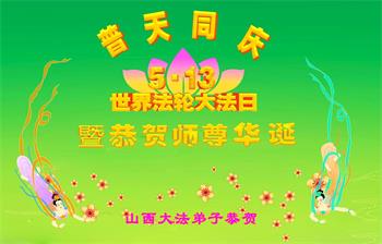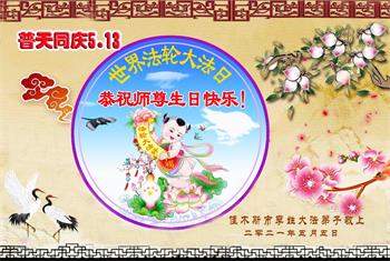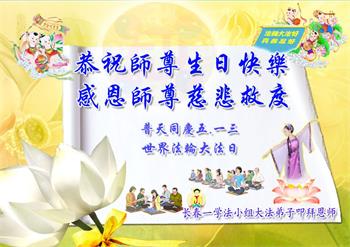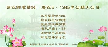 师父,五月十三日是我们每个法轮功学员心中最珍贵的日子!这一天是您的生日,是您首次传法的日子,也是世界法轮大法日。