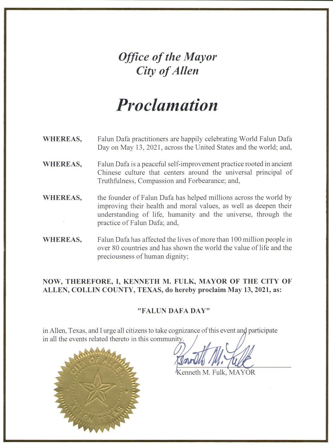 美国艾伦市(City of Allen)宣布“法轮大法日”