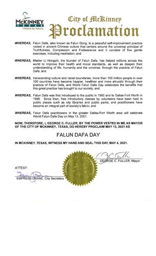 鉴此,我,乔治·富勒(GeorgeC Fuller),麦肯尼市市长,宣布二零二一年五月十三日为麦肯尼市“法轮大法日”