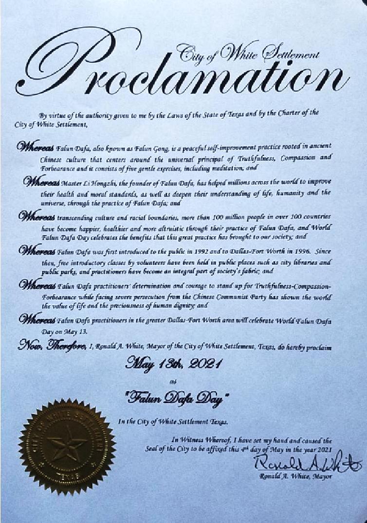 美国德州怀特塞特曼市(City of WhiteSettlement)宣布“法轮大法日”