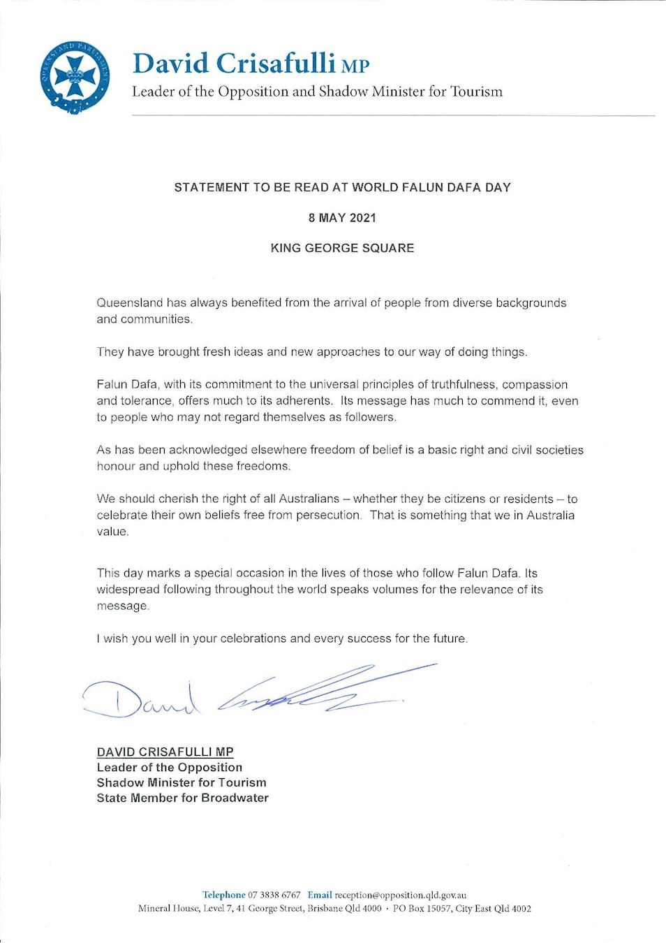 昆州布罗德沃特(Broadwater)选区自由国家党州议员、反对党领袖克里斯弗利(David Crisafulli)表示,祝愿法轮功在未来取得圆满成功。他说,这一天对法轮大法弟子而言是一个特殊的时刻。法轮功在世界范围内的洪传,充分说明了“真、善、忍”的重要。对不修炼的人来说,法轮大法传递的信息也是非常值得称颂的。