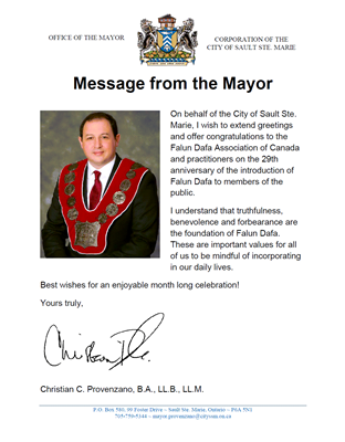 苏圣玛丽市市长克里斯蒂安·普罗旺斯诺(Christian Provenzano)在贺信中表示:我代表苏圣玛丽市,向加拿大法轮大法学会和法轮功学员致以问候,并祝贺法轮大法传世29周年。我了解真、善、忍是法轮大法的准则。这些在我们的日常生活中都是非常重要的价值观。