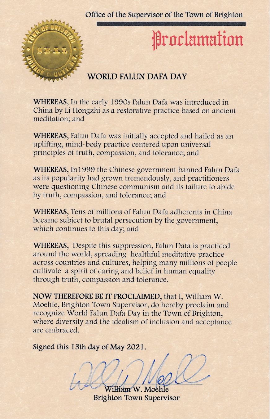 在此,我,威廉姆·莫尔,布莱顿镇镇长,在这个接受和包容多元文化的布莱顿镇,褒奖和认同 “世界法轮大法日”。
