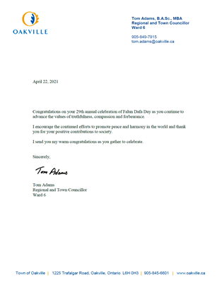 安省奥克维尔市(Oakville)市议员汤姆·亚当斯(Tom Adams)贺信写道:祝贺你们庆祝法轮大法29周年,继续弘扬真善忍的价值观。我鼓励你们持续努力促进世界和平与和谐,并感谢你们为社会做出的积极贡献。在你们欢聚之时,我向你们致以热烈的祝贺。