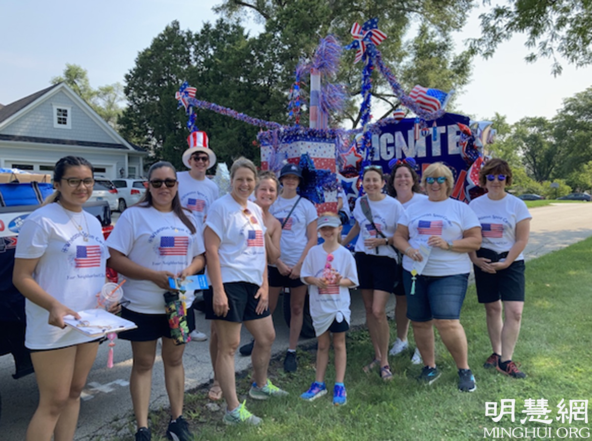 【明慧网二零二一年七月六日】二零二一年七月四日是美国独立二百四十五周年纪念日,伊州百年老城惠顿市(Wheaton)在疫情解封后恢复了庆祝独立日的传统。大芝加哥地区部分法轮功学员和一些周边地区学员参加了惠顿市举办的独立日游行,受到当地居民的热烈欢迎。法轮功学员的方阵最后被评为“最佳表演奖”。