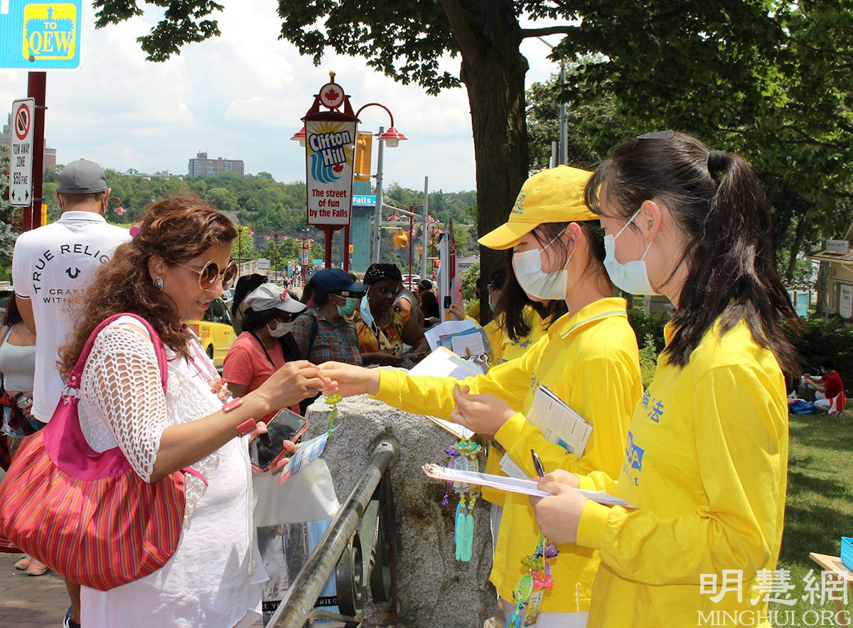 【明慧网二零二一年八月二十一日】(明慧记者章韵报道)风景优美的尼亚加拉大瀑布风景区每年都迎来大量世界各地的游客,由加拿大多伦多法轮功学员在此开设的炼功点每天开放,吸引了各地游客驻足观看,很多有缘人停下来学炼功法。有游客说:是神的旨意把我带到了这里;有学功法的游客说感受到神的召唤;还有开天目的游客看到这里是一片红光笼罩着。