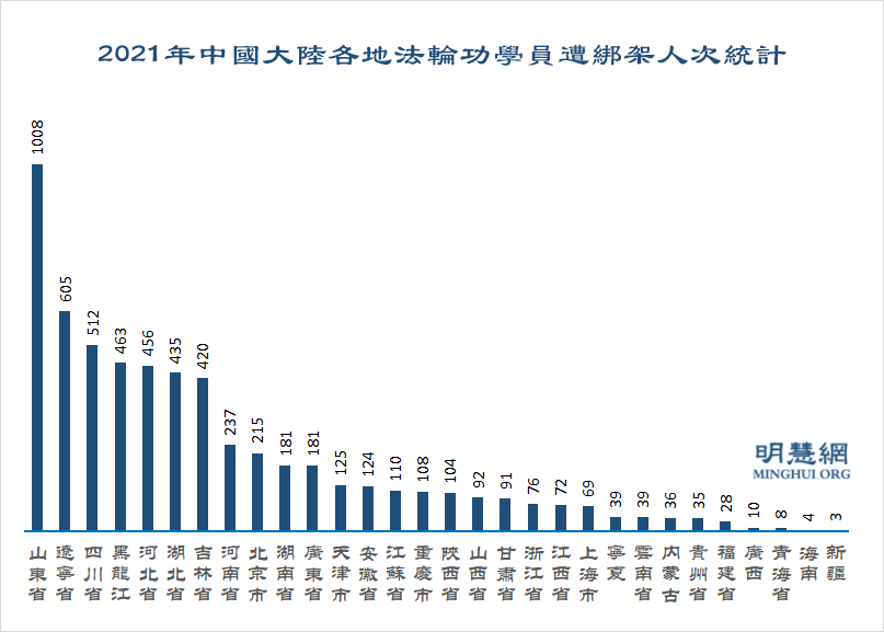 据明慧网报道统计,二零二一年中共警察绑架法轮功学员5886人。绑架最严重地区:山东省1008人,辽宁省605人,四川省512人,黑龙江463人,河北省456人,湖北省435人,吉林省420人。
