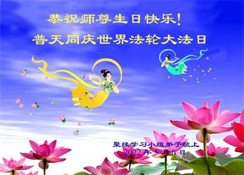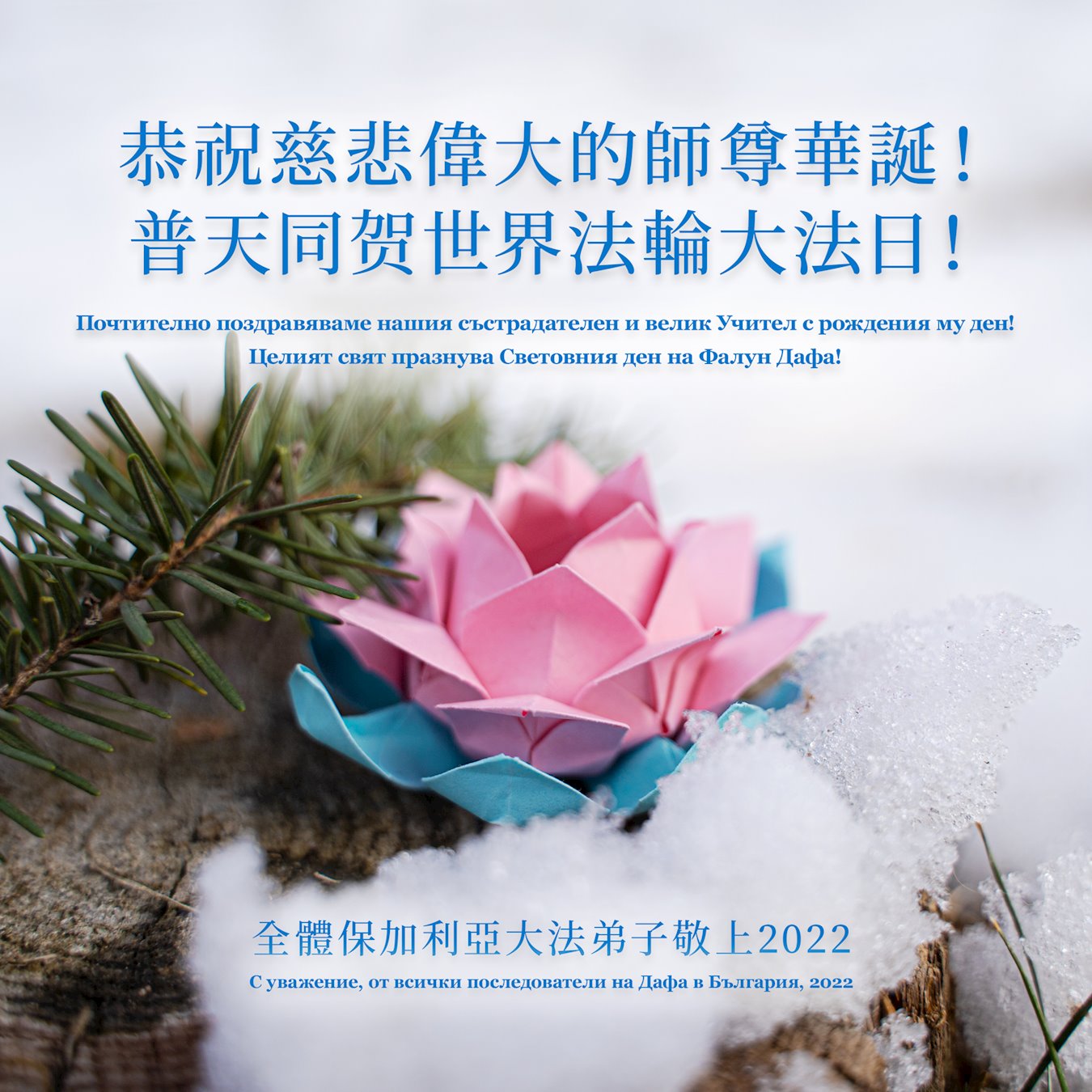 伟大的正法走到今天,迎来了大法洪传三十周年。佛恩浩荡,乾坤再造,穹宇感念!在这伟大的历程中,师尊救度并造就了我们,也救度了无量穹体、无尽众生于坏灭,赐予了我们与众生未来的一切。弟子们与众生对师父、对大法无比感恩之心难以言表。值此二零二二年世界法轮大法圣日来临之际,法国大法弟子向慈悲伟大的师尊表达问候与感恩!恭贺大法洪传三十周年!恭祝师父生日快乐!