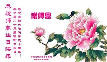 我是一个大法弟子的家人,妻子修大法,我也是个受益人,多次得到大法师父的救度,恭祝大法洪传三十周年!恭祝师父生日快乐!谢谢师父!谢谢大法!