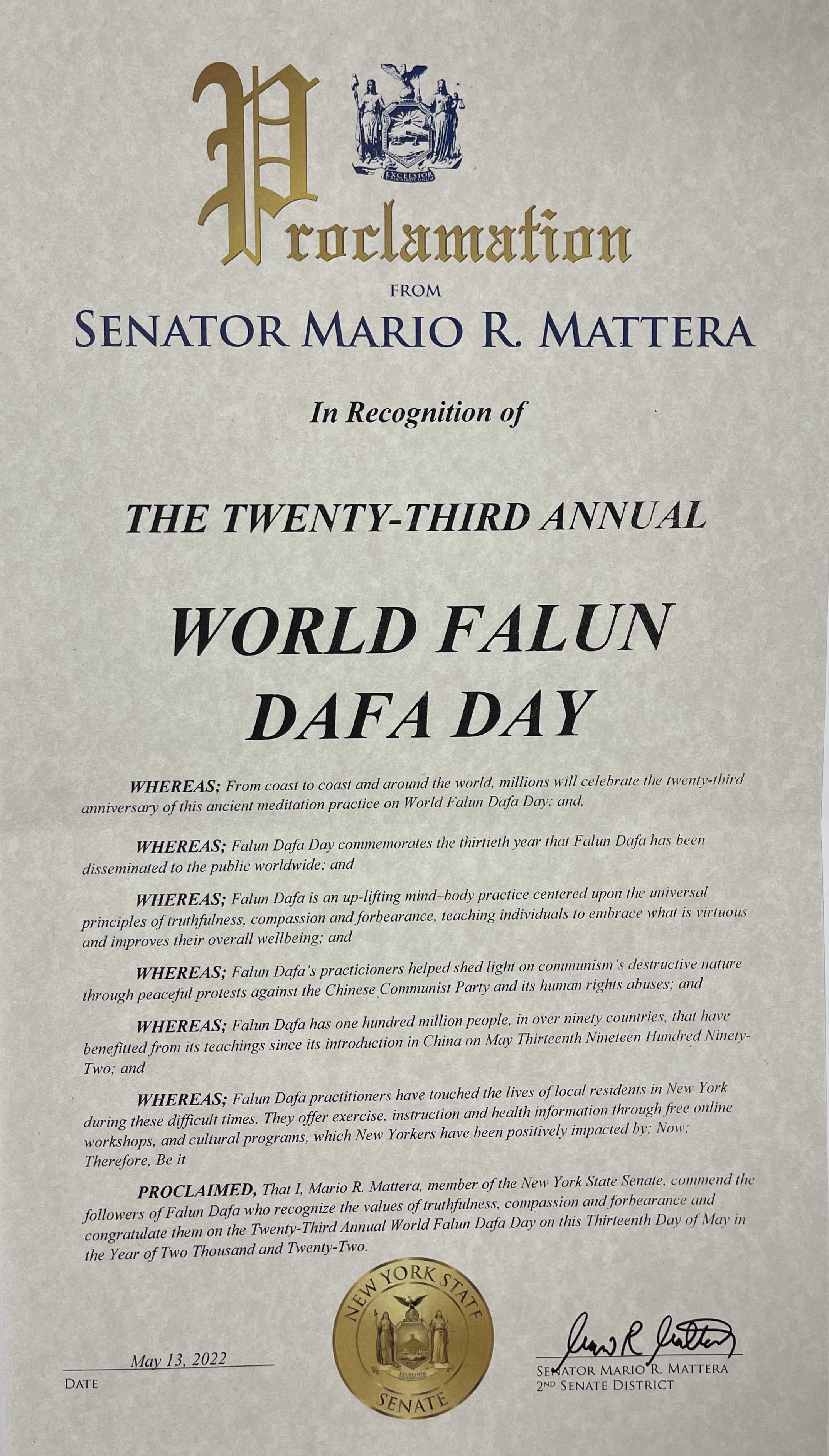 纽约州参议院第二选区参议员马里奥·马特拉(Mario R. Mattera)颁发褒奖令,赞扬法轮大法学员重视真、善、忍的价值,祝贺二零二二年五月十三日是第二十三届“世界法轮大法日”。