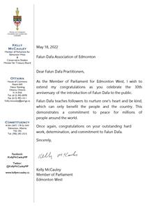 埃德蒙顿西区国会议员麦考利(Kelly McCauley)为法轮大法的利国福民而喝采,“法轮大法教导学员修心向善,这对民众和国家有百益而无一害,并为世界上数百万人的安乐做出了贡献。再次祝贺你们出色的工作和不屈的精神。”