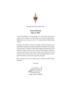 Sturgeon River-Parkland国会议员劳埃德(Dane Lloyd)说,“加拿大人享有信仰自由,法轮大法日是我们谨记这些根本而重要的权利的机会。我为法轮大法团体能够在加拿大自由地修炼和庆祝真、善、忍的精神传统而感到自豪。这些价值观对所有加拿大人而言都是宝贵的,也是任何自由、多元和民主社会所不可或缺的。”