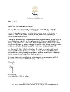 埃德蒙顿市长苏比(Amarjeet Sohi)发出了一张官方祝贺函,上书“祝贺二零二二年五月十三日法轮大法日三十周年”,全体十二位市议员名列其上,苏比则代表市议会亲笔签名。