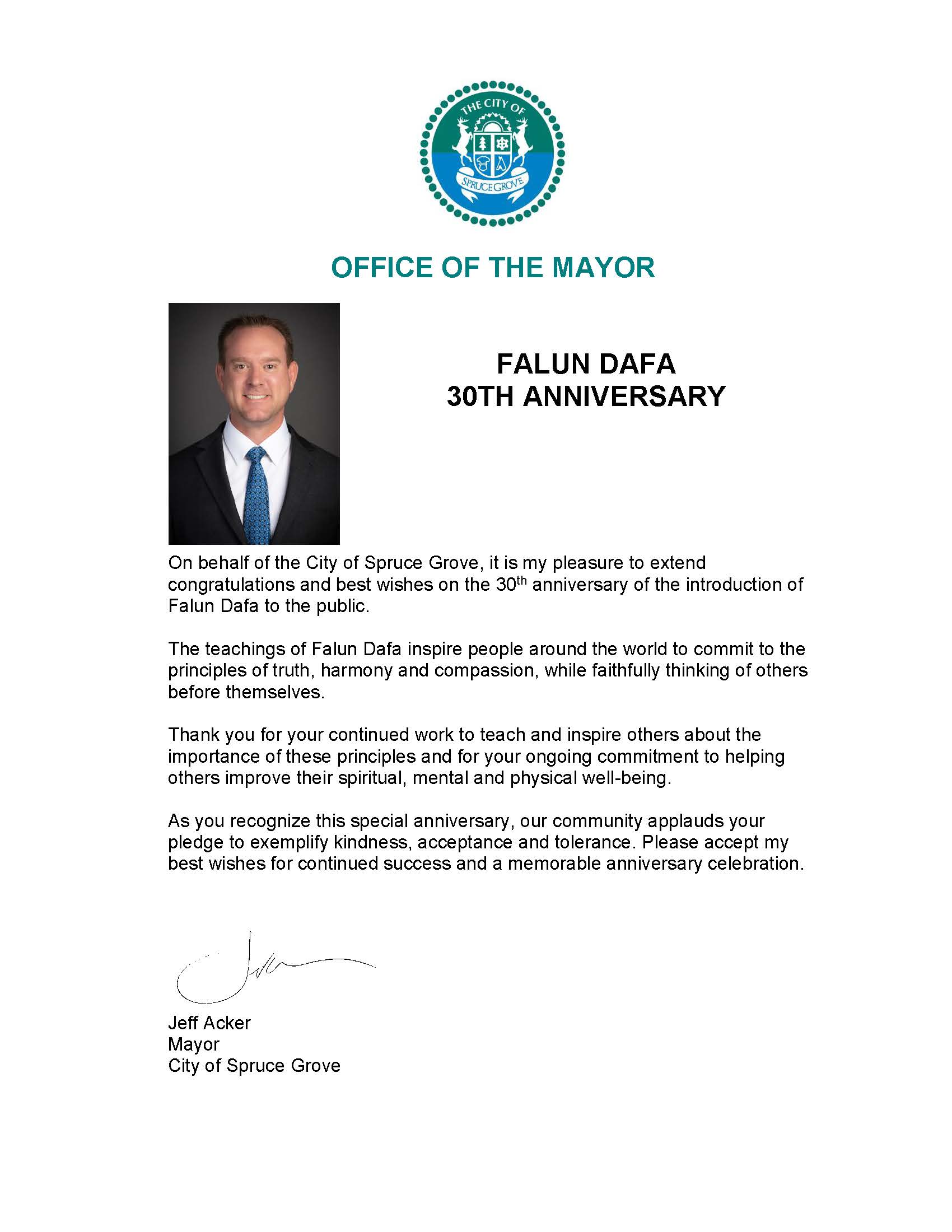 我谨代表云杉林市荣幸地祝贺法轮大法传世三十周年,并致以最美好的祝愿。