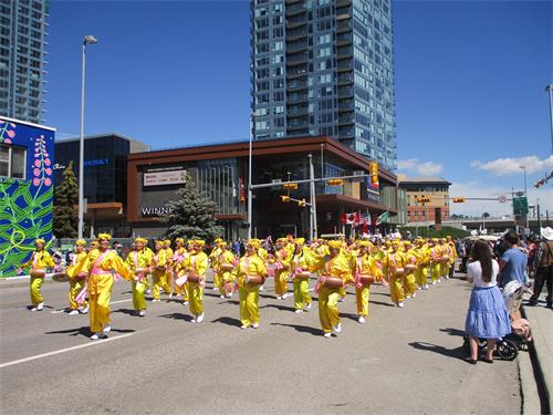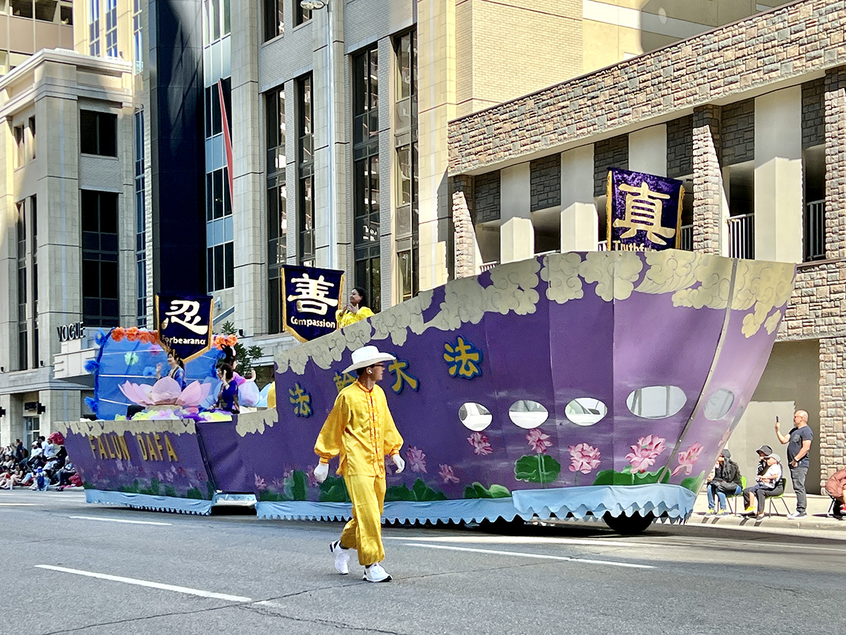 法轮大法方阵由卡尔加里、埃德蒙顿和温哥华三个地区的学员组成,以蓝底黄字的“法轮大法”开道,之后是黄衣白裤的二十人炼功队;在“真善忍”横幅后面,宏伟的法船花车缓缓穿行,年轻美丽的仙女坐在莲花台上,笑容祥和,不时向观众挥手致意;伴着铿锵的乐曲,五十人的腰鼓队整齐划一,亮丽登场。