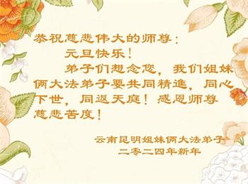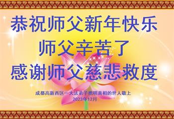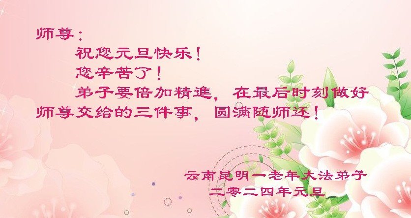 【明慧网二零二三年十二月三十一日】(明慧网记者综合报道)时光飞逝,岁月如梭,转眼即到了2024年。中国各省市、自治区的大法弟子,在各行业工作的新、老学员,遍及城市乡村、坚持以各种方式向民众传播真相的大法弟子们恭祝师尊元旦快乐!