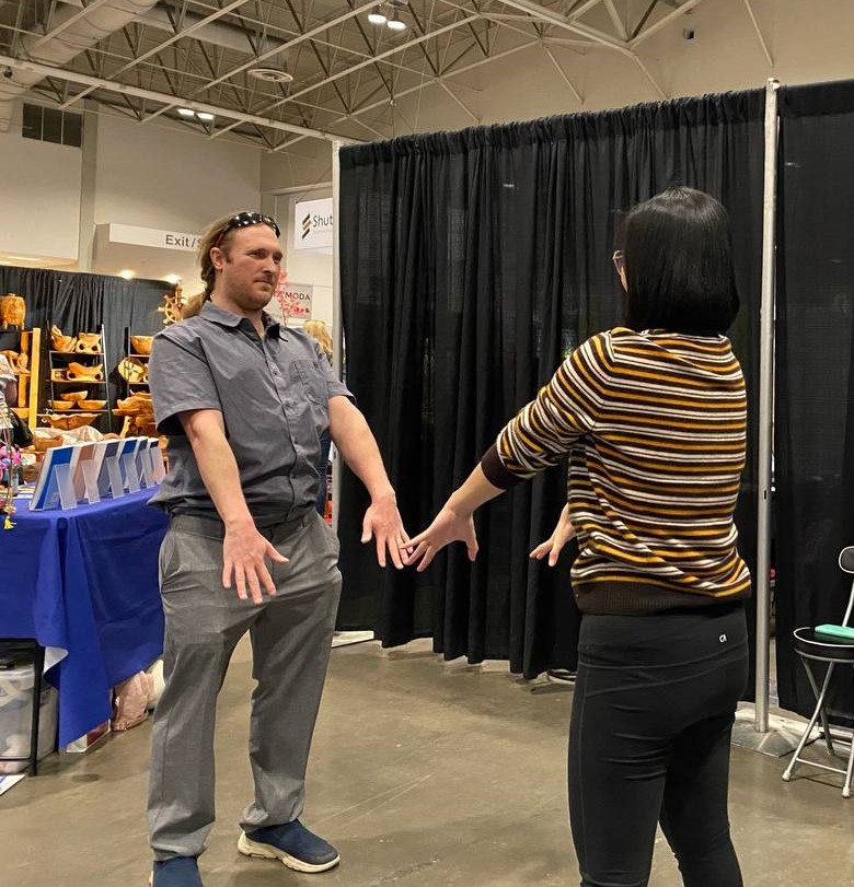 拜伦(Byran)经过展位时直接就告诉学员他想要学功。学完功他说,“我好喜欢这个功法。首先是第一套功法,有拉伸和放松的动作,然后第二套功法站桩又是静态的。炼第一套功法让我感到身体拉伸开了,不那么紧绷了,炼第二套功法矫正了我的体态,让我感到非常舒服。”