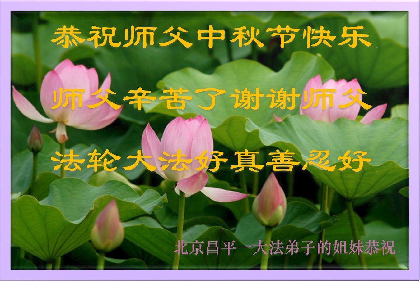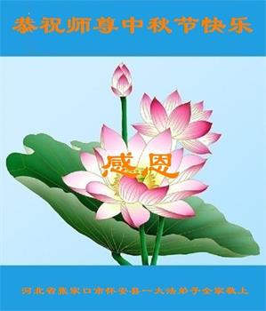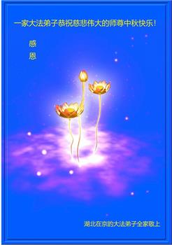 我们家还没有修炼法轮功,但是,我们全家人都知道法轮功是个好功,是教人做个好人,能使身体健康无病的。我们亲戚有炼法轮功的,邻居也有炼的。他们修炼后,变化都很大,是大家公认的好人。这些年,打压这么厉害的情况下,他们不怕死,不怕抓,仍然坚定的修炼法轮功,我们从心里佩服,现在社会上这样的人不多。都是李大师好,才能教育出这么些好徒弟。这些年,因为我们相信法轮功好,帮助法轮功学员躲避迫害,也得到李大师的保护,全家老少身心健康,工作顺利,生活的幸福快乐!我们从心里感谢李大师的恩情。我们全家人恭祝李大师中秋节快乐!李大师您辛苦了!