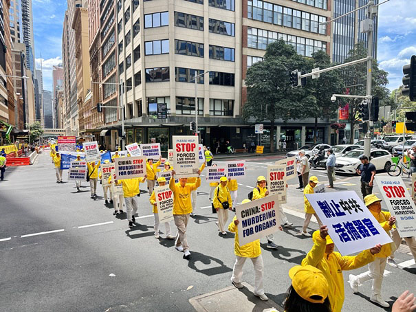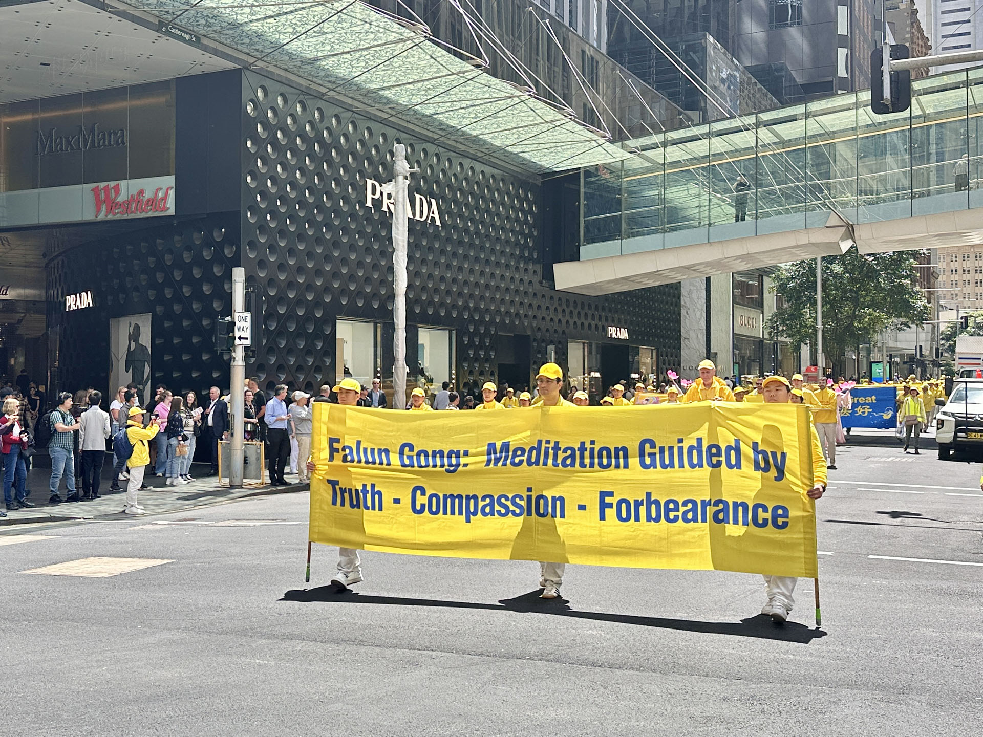 中午12点30分,浩浩荡荡的游行队伍由警车开道,从悉尼金融中心——马丁广场(Martin Place)出发。游行由三大方阵组成,分别是“法轮大法好”、“停止迫害法轮功”及“声援4.37亿勇士退出中共党、团、队”,展示了大法美好、二十五年反迫害以及“三退”大潮等真相信息。