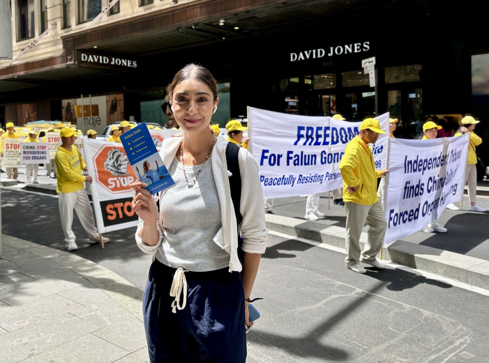 道恩(Dawn)是来自达尔文的行政官员。她说:“游行色彩十分鲜艳。我看到飘扬的旗帜(和横幅),才意识到这是怎么回事。我原先并不知道活摘器官的事,这太可怕了。我感受到了游行所传递的信息,所以这很有效,也很引人注目。”