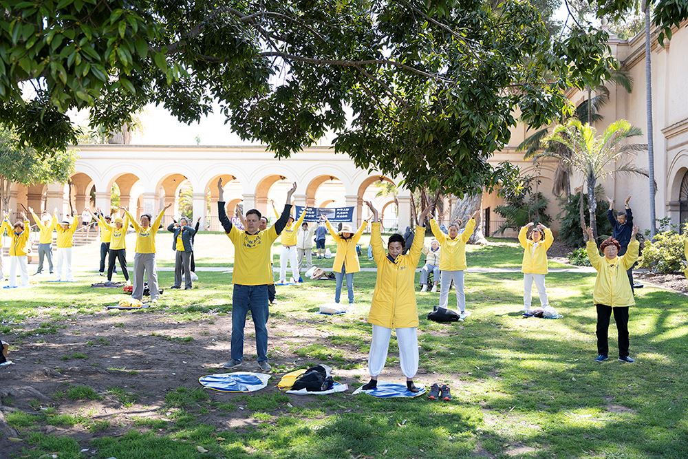 ![]() 图1:法轮功学员集体炼功,展示祥和的五套功法。 |