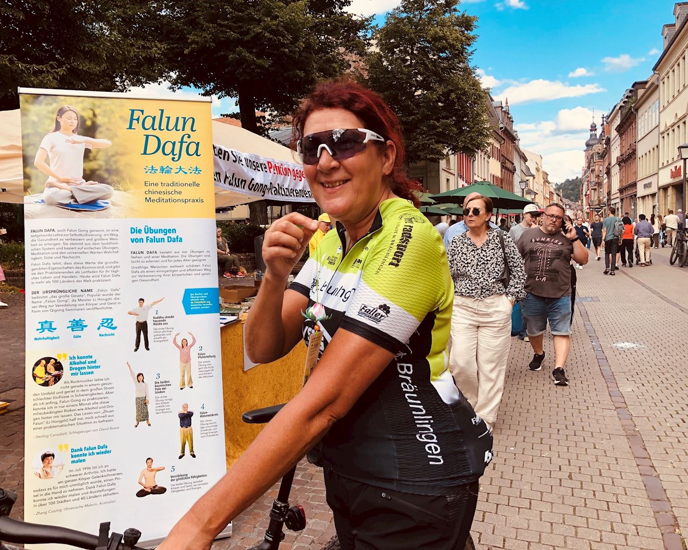 图1:二零二四年七月十三日,德国莱茵-内卡地区法轮功学员在著名旅游名城海德堡(Heidelberg)举办纪念反迫害二十五周年的活动。图为法轮功学员向路人展示功法。
