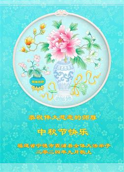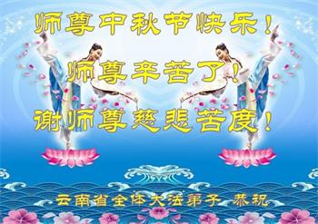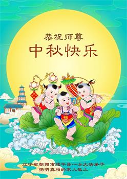 以下来自北京市、天津市、上海市、黑龙江省、吉林省长春市、吉林市、辽宁省沈阳市、新宾县、鞍山市、内蒙古自治区、宁夏回族自治区、山东省菏泽市、河北省石家庄市、河南省许昌市、三门峡市、湖北省武汉市、咸宁市、江苏省连云港市、浙江省、四川省自贡市、云南省等地的被非法关押大法弟子,以及被非法关押在黑龙江省泰来监狱、呼兰监狱、河南省新乡监狱、江苏省苏州监狱、云南省昆明监狱的大法弟子托亲友们发来敬献给慈悲伟大的师父的中秋贺词贺卡。