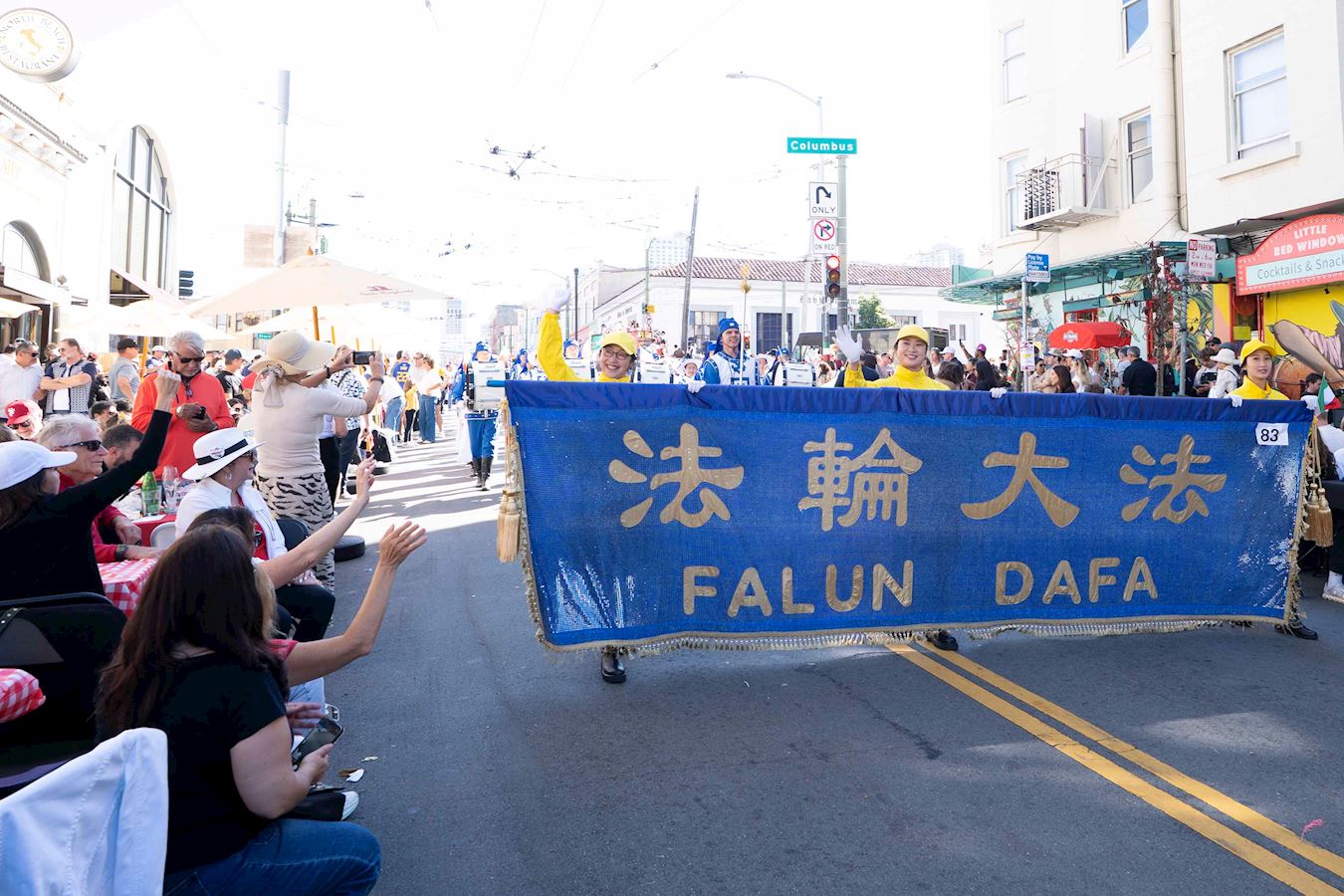 “再次感谢天国乐团。”主持人说,“他们一直是旧金山意大利传统文化游行的亮点之一。天国乐团已经参与游行超过十五年了。感谢你们的支持。”