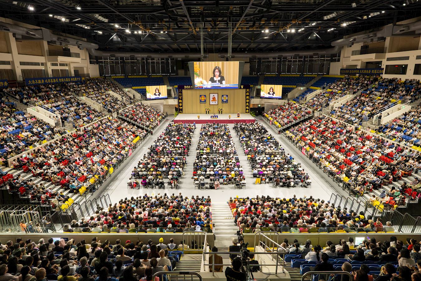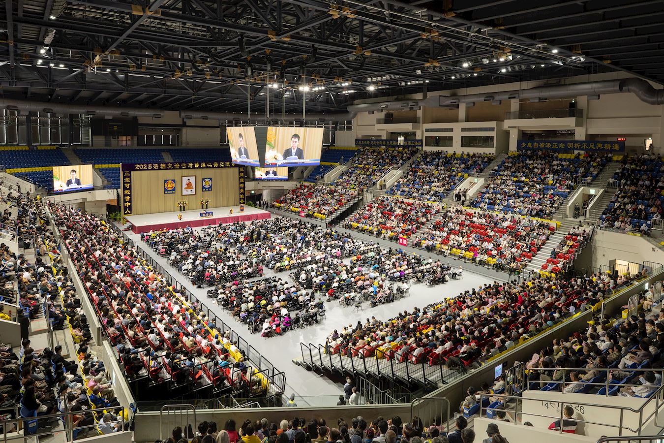法会会场庄严殊胜,主席台正中央悬挂着法轮功创始人李洪志师尊的法像,两边是《洪吟二》〈法正乾坤〉的诗句:“慈悲能溶天地春 正念可救世中人”。面对主席台的后方挂有“正念正行”的巨型横幅,勉励学员精進不懈。